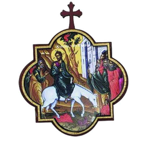 Μια μικρή αλλά επιβλητική εικόνα που παρουσιάζει τη θριαμβευτική είσοδο του Κυρίου στα Ιεροσόλυμα, όπου ο λαός Τον υποδέχεται με βάια και δοξολογία. Η παράσταση αποπνέει χαρά, ειρήνη και την προσμονή της Μεγάλης Εβδομάδας, υπενθυμίζοντας ότι ο Χριστός εισέρχεται στη ζωή μας ως Βασιλεύς της ειρήνης.