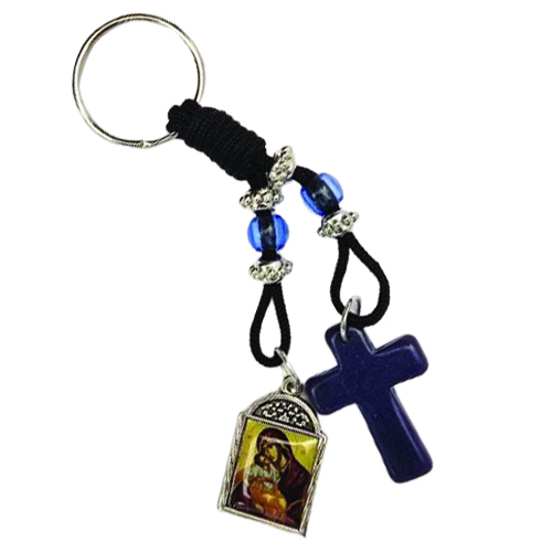 Κομψό μπρελόκ με μεταλλικό σταυρό, φτιαγμένο με σεβασμό και προσοχή στη λεπτομέρεια. Στην μία πλευρά φέρει την εικονίτσα της Υπεραγίας Θεοτόκου, προστάτιδας και παρηγορήτριας των πιστών, ενώ στην άλλη πλευρά βρίσκεται η εικόνα του Αγίου Χριστοφόρου, φύλακα των ταξιδιωτών και προστάτη των οδοιπόρων.
