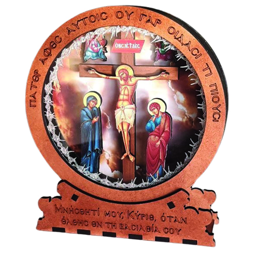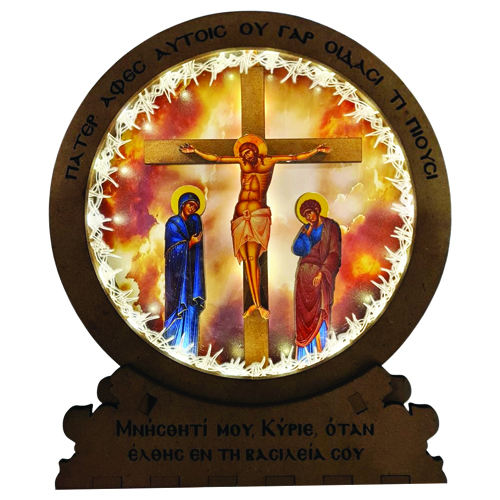 Ένα μοναδικό εκκλησιαστικό έργο τέχνης φωτιζόμενo με μπαταρίες και λάμπες led που απεικονίζει τη Σταύρωση του Κυρίου, την Παναγία και τον Άγιο Ιωάννη. Στη δεξιά και αριστερή πλευρά του Σταυρού, οι ιερές μορφές στέκουν με κατανυκτική παρουσία, ενώ στο προσκήνιο δεσπόζει λεπτοκατασκευασμένο λυπητερό στοιχείο ως σημείο προστασίας και ευλάβειας.