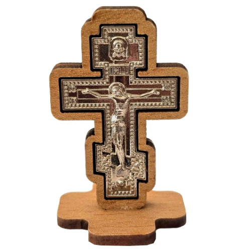 Ένας διακριτικός και καλαίσθητος σταυρός, συνδυασμός ξύλου και μεταλλικού στοιχείου, στερεωμένος σε κομψή βάση.
